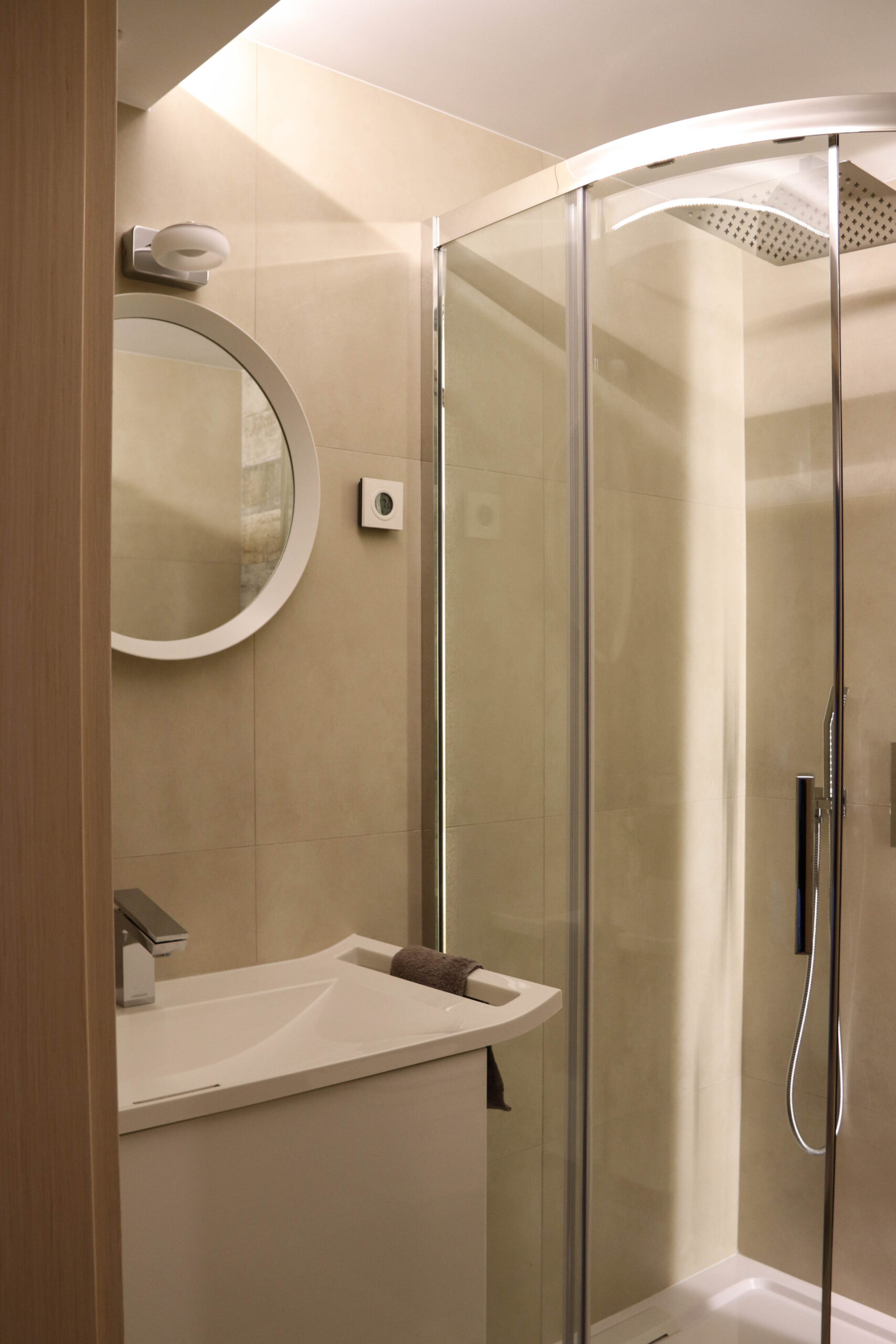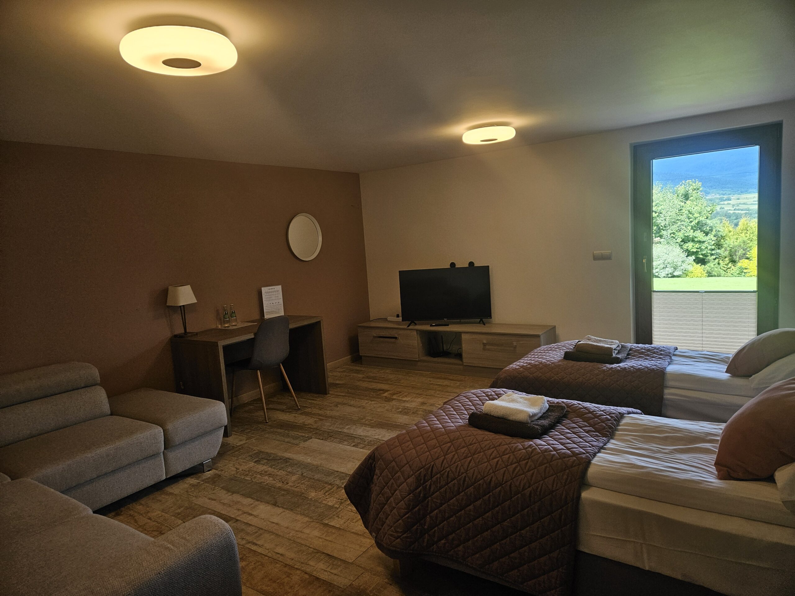 - Udogodnienia: biurko, dostawka (opcja), ogrzewanie podłogowe, pościel, ręczniki, suszarka, taras, TV