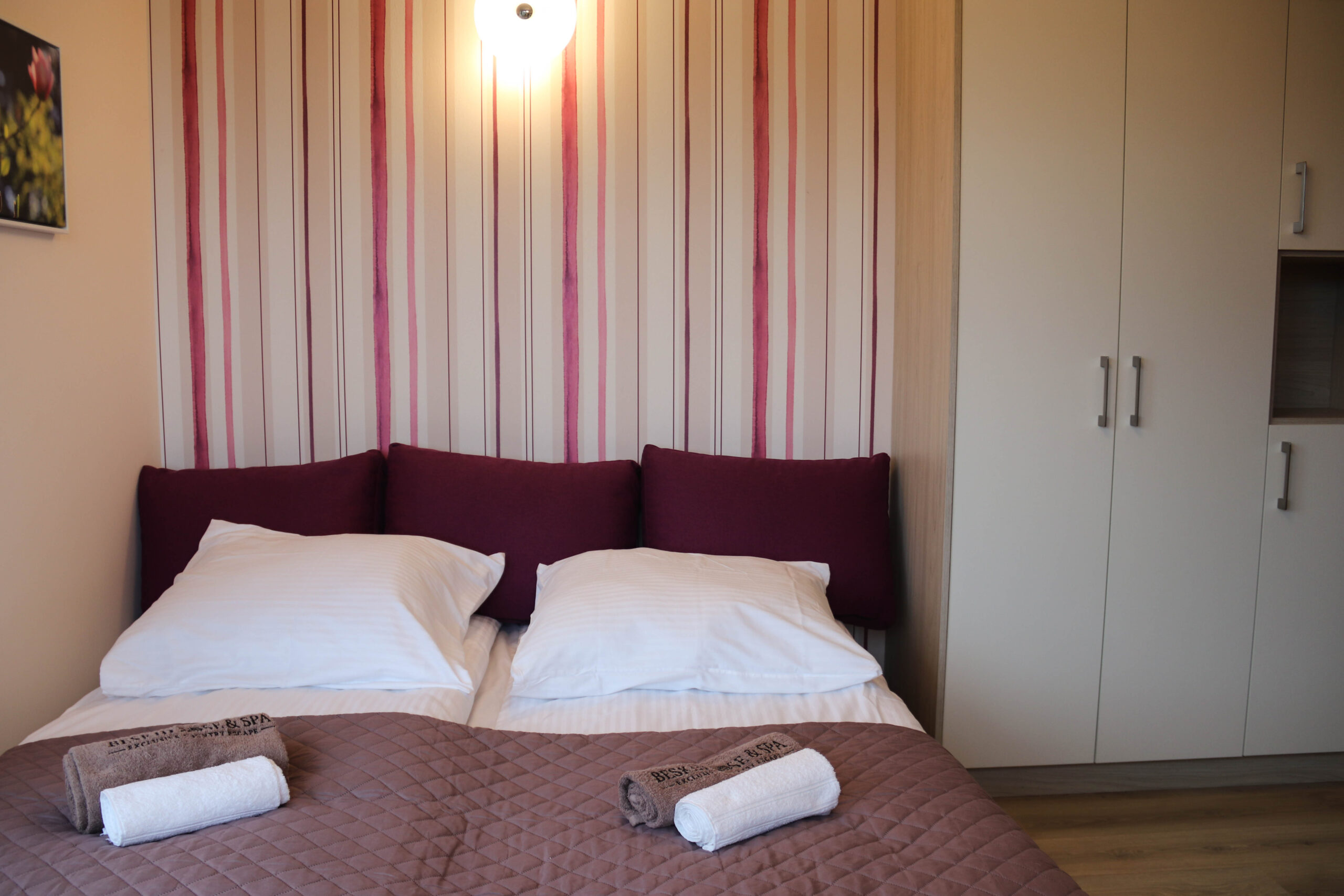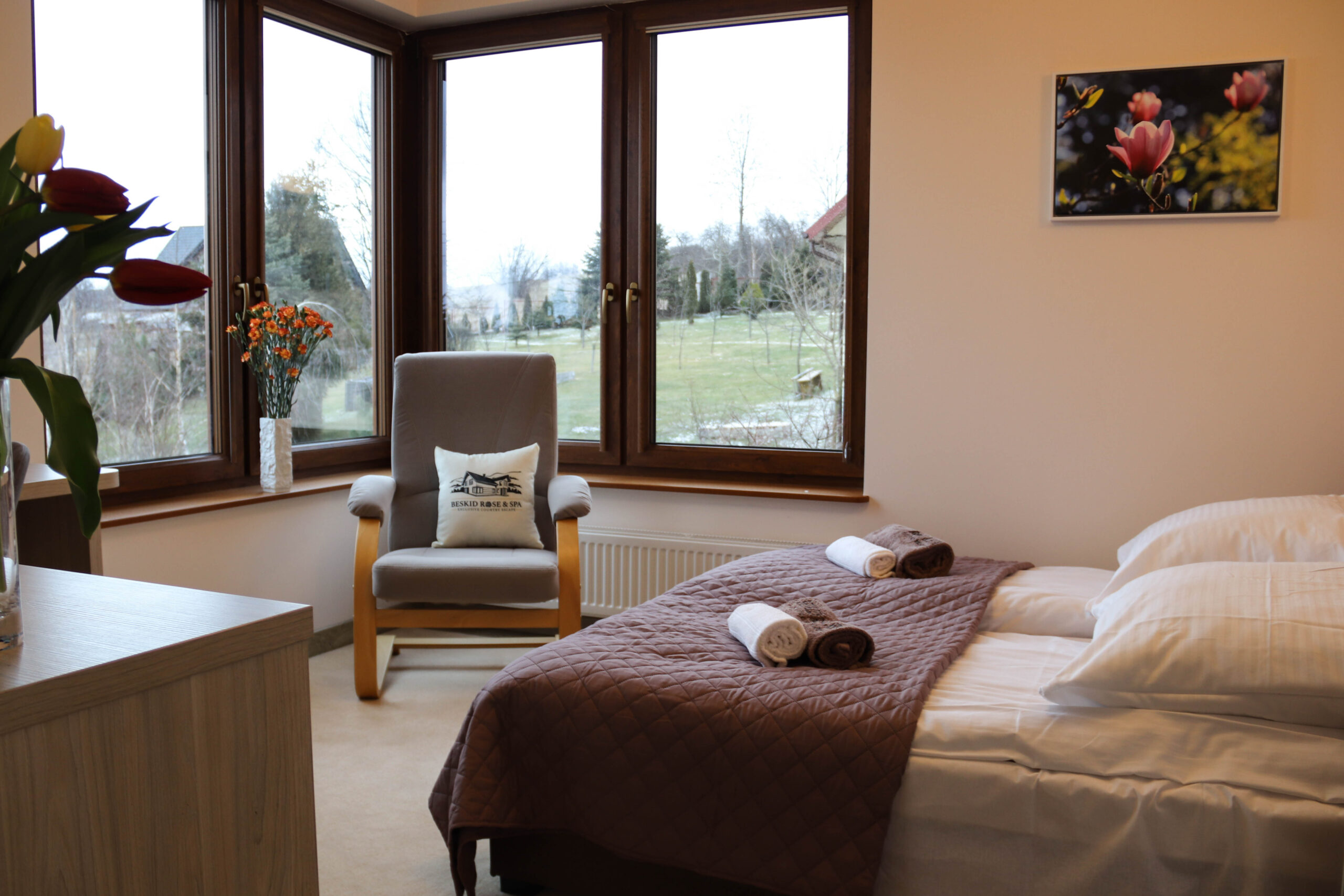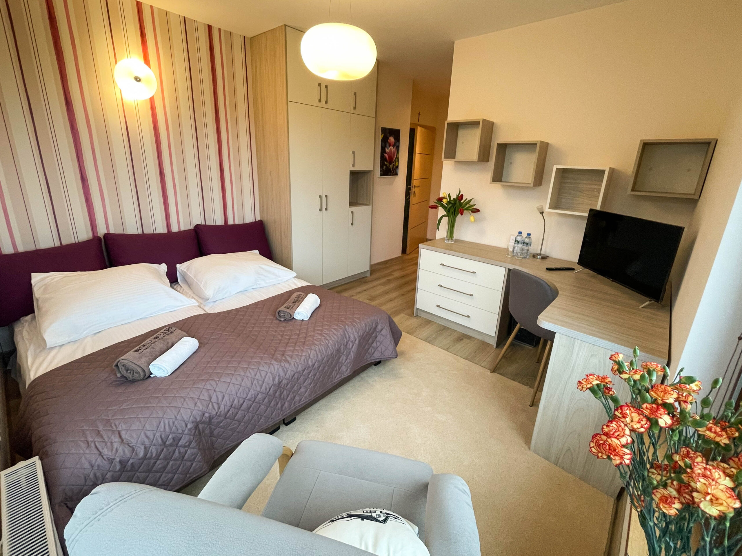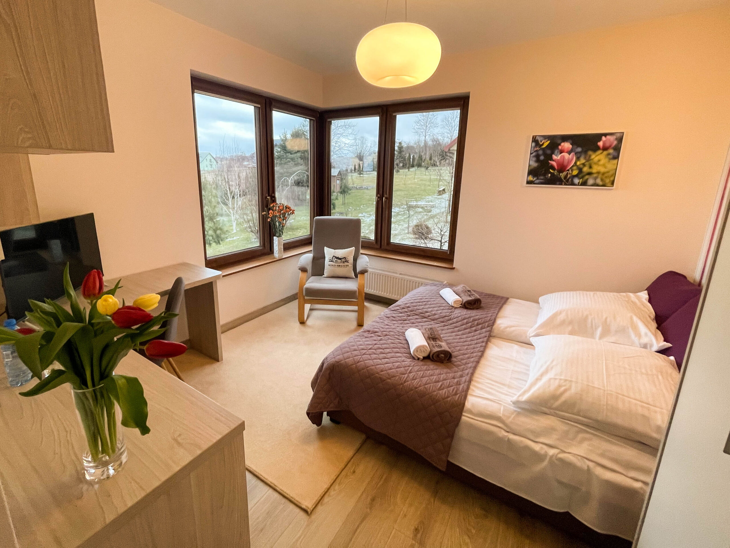 - Udogodnienia: biurko, dostawka (opcja), łazienka dla osób z niepełnosprawnych, ogrzewanie podłogowe, pościel, ręczniki, suszarka, szafa na ubrania, TV