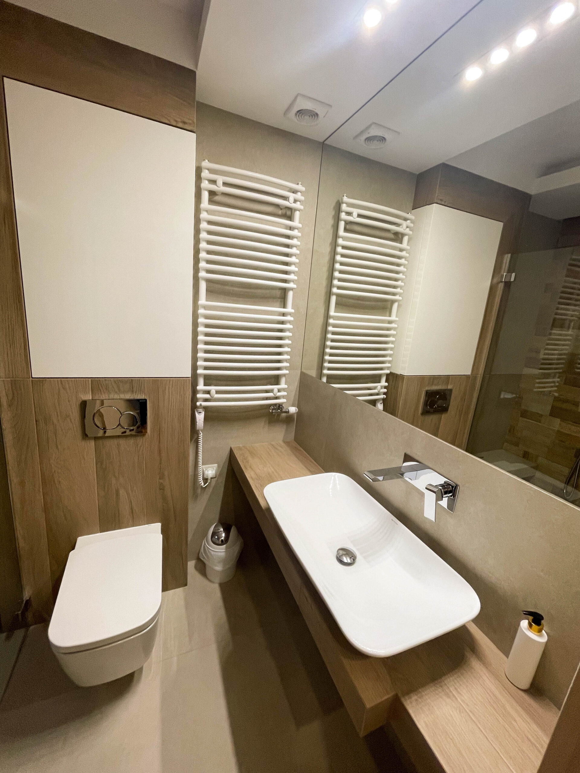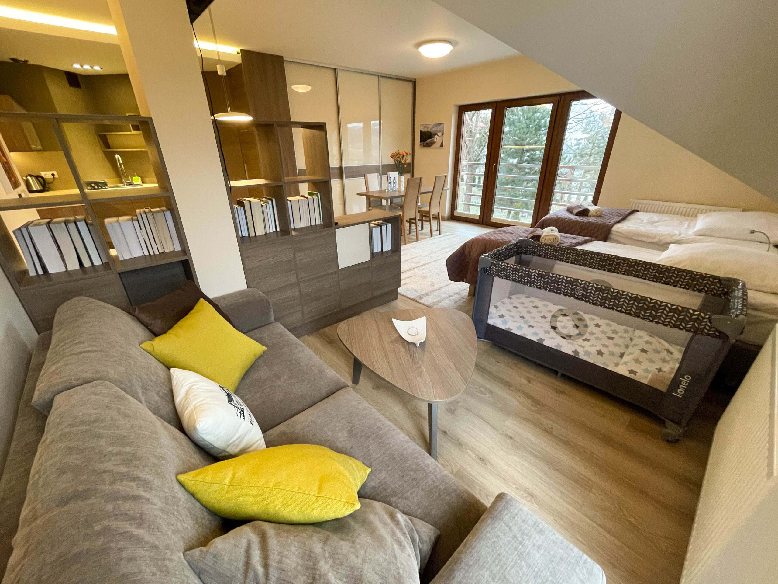 - Udogodnienia: aneks kuchenny, balkon juliet, dostawka (opcja), łazienka, ogrzewanie podłogowe, pościel, ręczniki, stolik + krzesła, suszarka, szafa na ubrania, TV